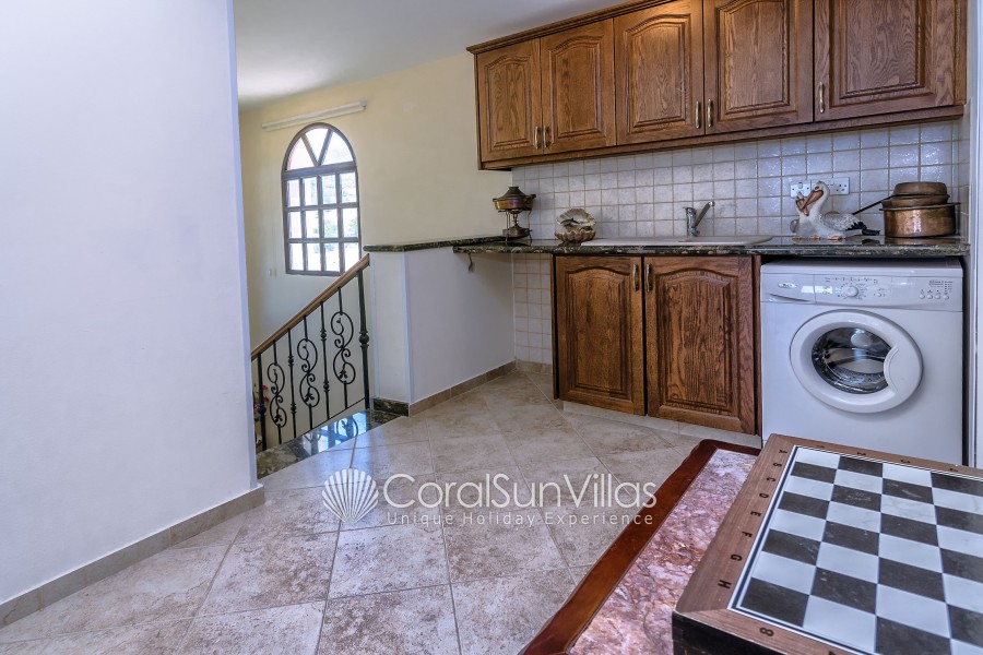 GROUND FLOOR: - Entrance Hall leading to the spacious living area comprising of sitting room with live fire, dining area and kitchen. Fully Fitted Kitchen with Washing Machine, Dishwasher, Fridge Freezer, Cooker, Microwave, Kettle, Toaster, Frappe Machine, Coffee Maker, Etc. Iron and Ironing Board Patio doors lead to terrace and large swimming pool. - TV flat screen with English channels, DVD and CD player in lounge and free WiFi with high-speed broadband. - Superbly fitted kitchen complete with oven, hob, fridge freezer, dishwasher, microwave oven and washing machine. - Fully equipped shower-room. - Bedroom 1: Double-bed bedroom, fully fitted. Patio doors leading to the terrace and garden with sea view.