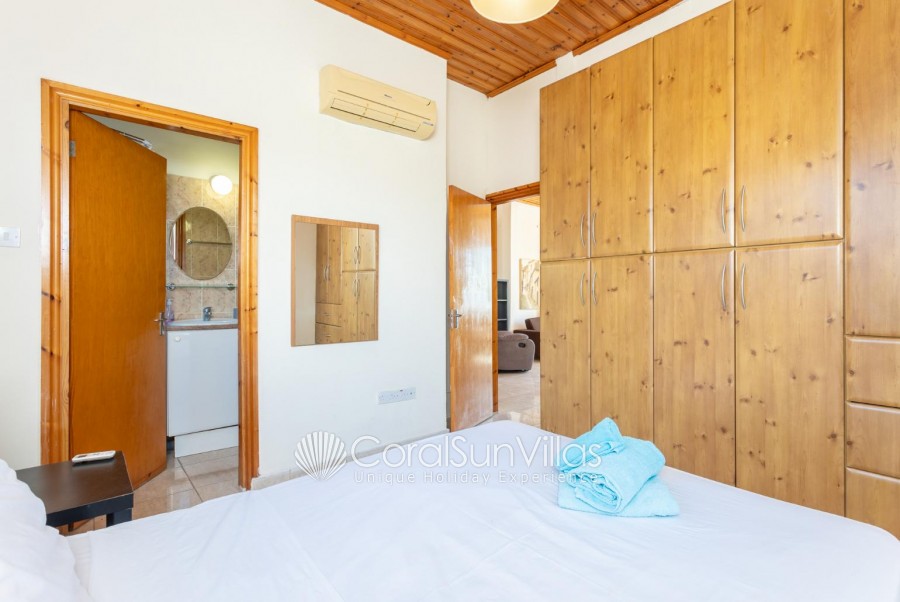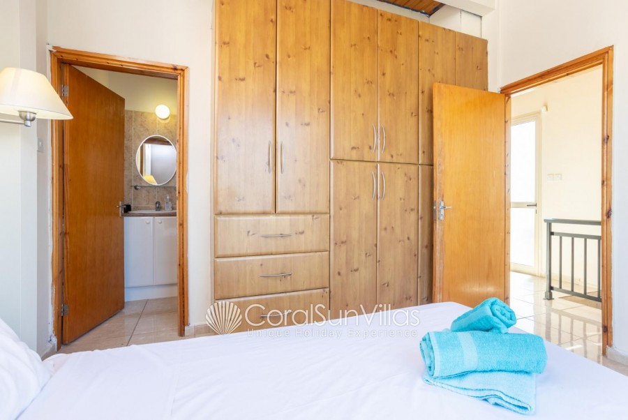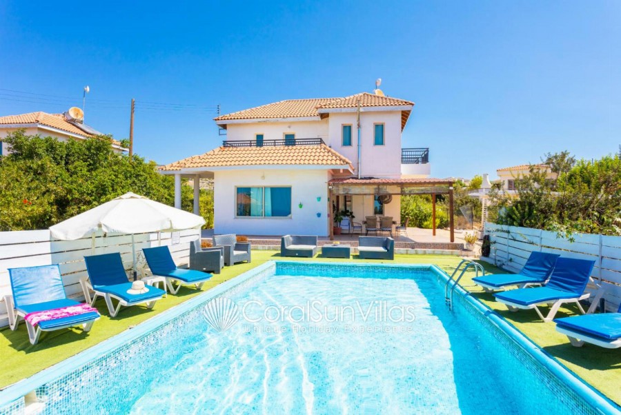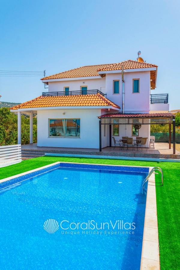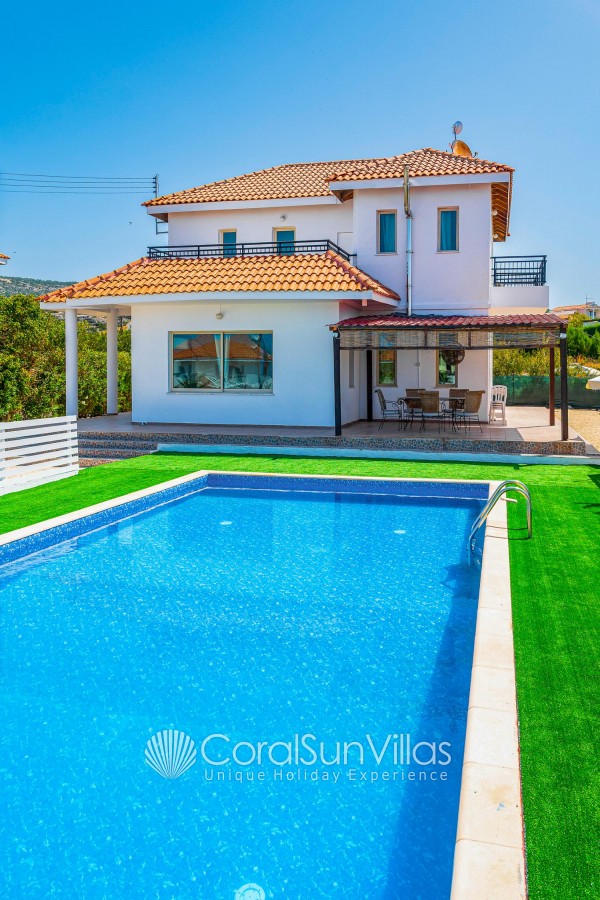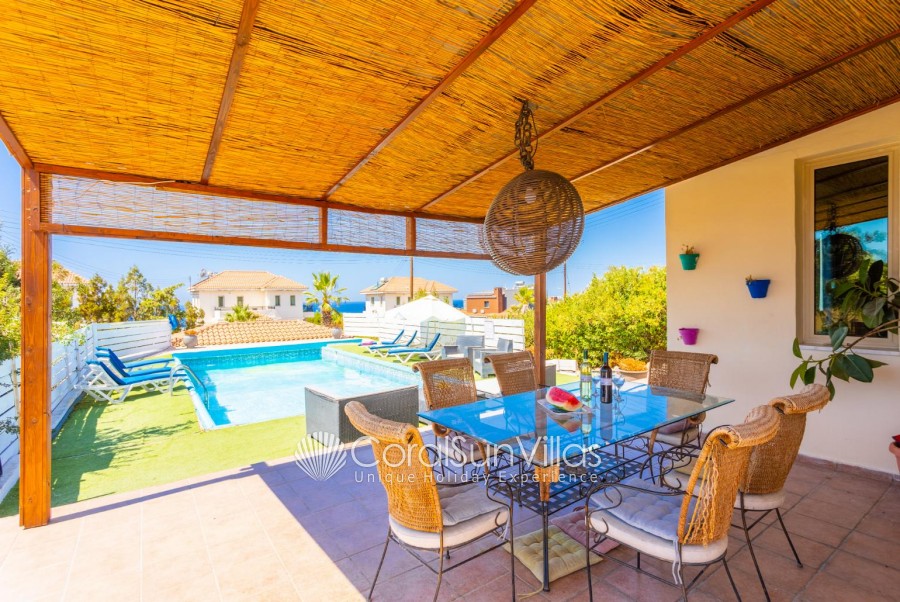 Villa is located in Coral bay Peyia. This detached vacation rental property offers air-conditioning, Free WIFI and sleeps up to 8 people with 4 Bedrooms and 5 Bathrooms. There is a private pool (South-West Facing) with barbecue and Garden sea views. Walking distance to the Restaurants.