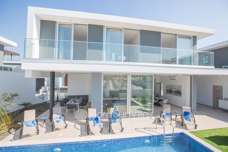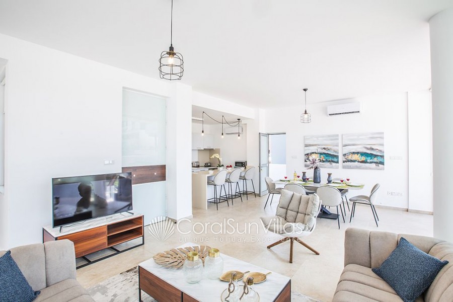 This new contemporary villa is located in the popular resort area of Protaras and is just a 5 minute walk to the nearest beach and with a variety of bars, restaurants and shops close-by, this is great central location for getting around without the need for a car. The villa is newly built and fully equipped with everything you need to ensure a perfect self-catering stay.