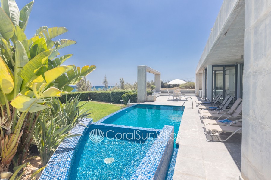 This beautiful and elegant 5 bedroom, sea front villa with HEATED PRIVATE POOL is located in a quiet cul-de-sac in the heart of Protaras, within walking distance to Fig Tree Bay Beach and all amenities.