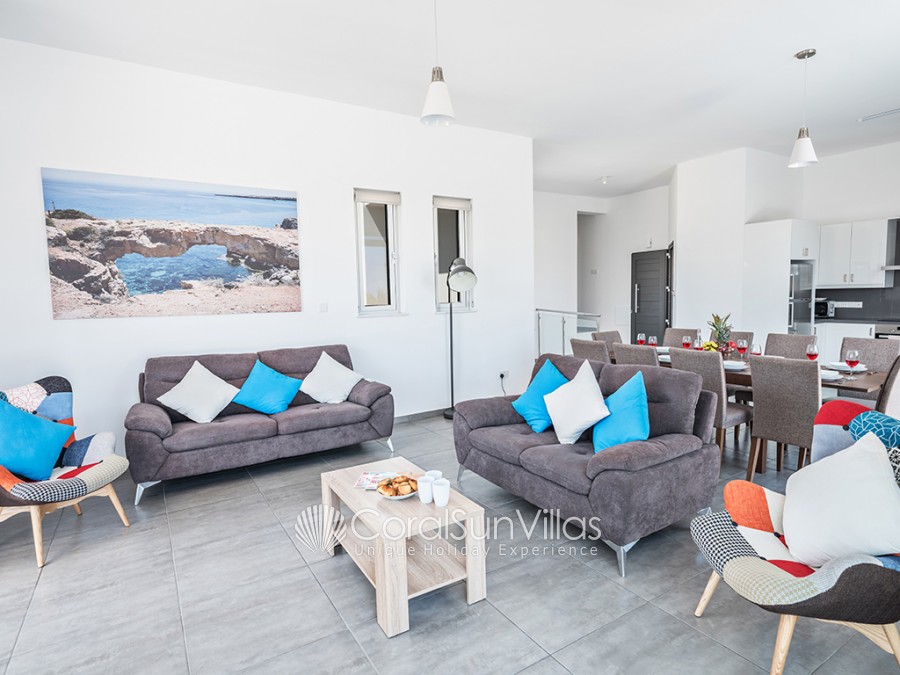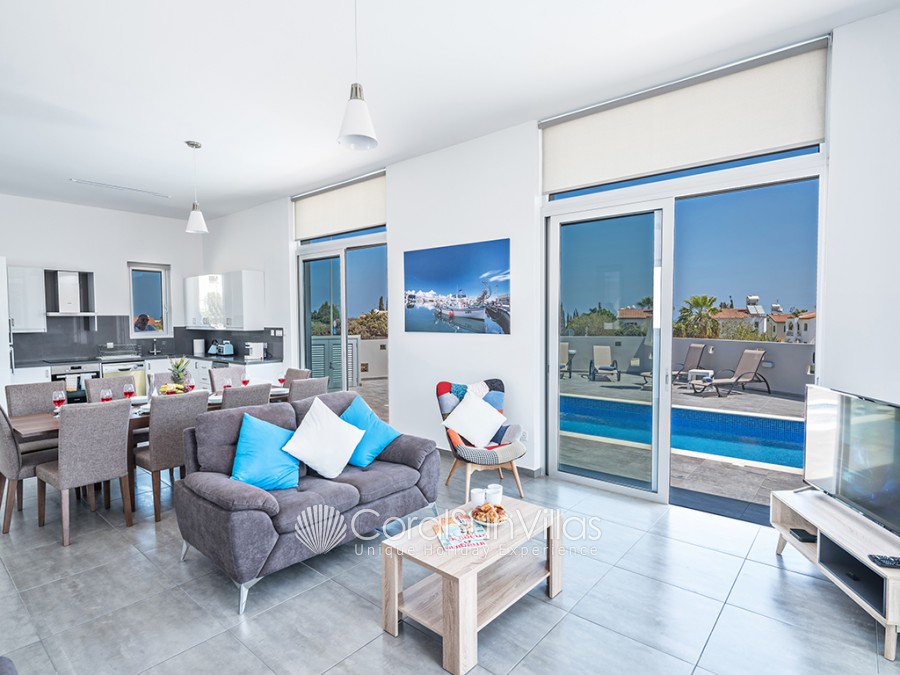 As you enter the villa, you will find the large fully equipped open-plan kitchen, living room with comfortable sofas and satellite TV and the dining area surrounded by patio doors leading to the pool and garden.
